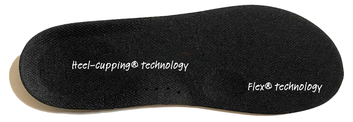 Our Insolia FLEX technology dramatically improves foot flexion and efficiency with a precisely-engineered asymmetrical depression in the front of the foot bed. This depression allows the ball of foot - the foot’s pivot point - to flex naturally eliminating the need to over-grip the shoe while moving. It also allows the foot to push off efficiently and lift the body while moving forward. This movement increases the efficiency of movement so much so that testing has shown to reduce oxygen demand and improve stride length. It also allows the arch to naturally rise on its own creating a dynamic natural arch support.